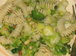 - Mientras tanto, calentar la mantequilla y el aceite en un sartén grande, hasta que la espuma se disuelva; luego cocinar los piñones, revolviendo constantemente, hasta que se doren (1-2 minutos). Añadir las coles de Bruselas, 1/2 cdta de sal y 1/4 cdta de pimienta, y saltear a fuego medio-alto hasta que las coles estén tiernas y ligeramente doradas (unos 4 minutos).