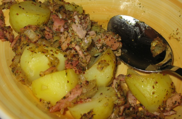 Siguiendo en la onda Irish, aquí les va otra receta que combina ingredientes típicos de esta cocina. También es sacada de Irish Food & Cooking, de Biddy White Lennon y Georgina Campbell. Esta ensalada (que dietética no es) se puede servir caliente o fría. El meollo del asunto es traducir la variedad de papa que se necesita.