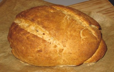 Sé que suena a fetiche gastronómico, pero no hay nada más satisfactorio que hornear pan.  En estos días hice queso (receta pendiente) y me sobró un montón de suero.  Buscando qué hacer con él (y a falta de tener una porqueriza en la terraza de la casa), la alternativa sonaba deliciosa: hacer pan y utilizar el suero en lugar de agua.  El resultado es un sabor mucho más fuerte, más «artesanal» (y según dicen, un pan mucho más nutritivo).  Tengo que admitir que todavía me falta mucho por aprender.  Me encantaría lograr una textura más esponjosa, por ejemplo, o que la miga me quede un poco más suelta.  Pero no hay nada como comer un pan casero recién hecho, así que seguiré intentando hasta dar con la receta ideal…