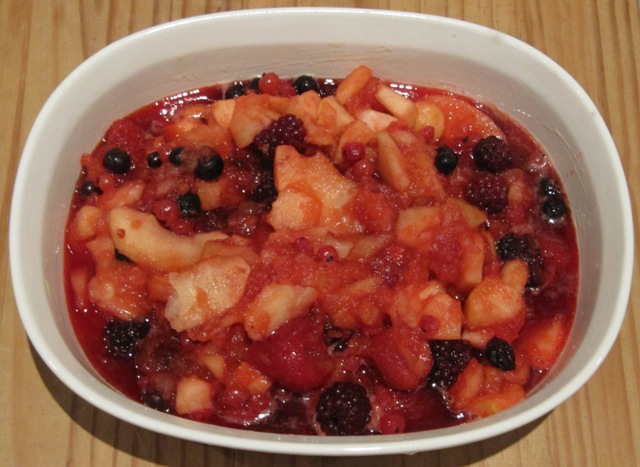 • Echar las frutas cocidas en un molde enmantequillado para pie (con capacidad para 900 ml, aproximadamente).  Como pueden ver en la foto, yo utilicé un refractario pyrex (de litro y medio).