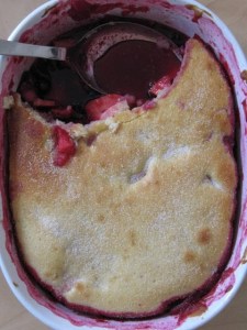 Este pudín se puede rellenar sólo de manzanas, o hacer un mix de manzanas y bayas.  O sustituir las manzanas por peras, melocotones, mango o cualquier fruta carnosa.  Lo bueno es que, aparte de lo fácil que resulta prepararlo, me parece que es un postre bastante sano.  La cantidad de azúcar se puede reducir muchísimo.  Si hacen alguna sustitución, dejen un comentario contando qué tal.  Lo preparé un jueves por la tarde y ya no quedaban ni las migas el sábado por la mañana.  Hugo declaró que era probablemente uno de los mejores postres que ha comido.  Sospecho que haremos esta receta muchas veces, y que estaremos copiando muchas otras de Darina Allen…