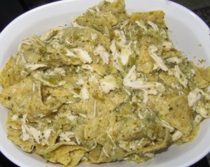La foto es nefasta, lo admito, pero no hay nada más rico que unos buenos chilaquiles.  Aquí les paso una receta-combo que mezcla la de Cook’s Library Chicken (Parragon Publishing) y la de Rick Bayless, en Authentic Mexican. Qué tan auténtica sea, no lo sé, pero sí puedo asegurar que es rica, fácil y si no la hacen muy picante, es el típico plato que les encanta a los niños porque tiene «tostitos».  Se puede hacer simplificada, comprando la salsa verde y las tortillas ya listas, o se puede elaborar un poco más. Les pongo las dos opciones.