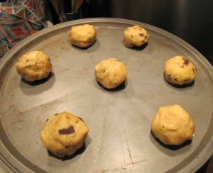 - Enharinar el mesón o la superficie donde vayan a poner las bolitas, y enharinarse bien las manos. Sacar una cucharada de «masa» y formar las bolitas con las manos, compactándolas lo más posible. Una alternativa es ponerles un cuadrito de queso en el centro (tipo mozzarella, queso paisa o algún queso que se derrita). Esto es delicioso, pero les sugiero que primero le agarren el truco a formar las bolitas antes de ponerse a experimentar con rellenos.