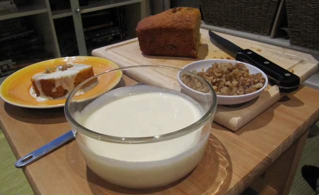 - Mientras tanto, para hacer el glaseado: mezclar la nevazúcar / azúcar impalpable, mantequilla previamente suavizada (puede ser con un tenedor), queso crema y vainilla. Batir bien.