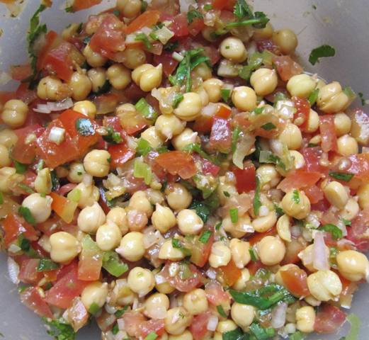 Mil quinientos años después, a unos minutos de mi casa abrieron un restorán llamado Montys of Kathmandu, y Hugo me regaló una clase dictada por la dueña del sitio. Esta receta, llamada chana saandheko (साँधेको, sadeko o sandheko), fue uno de los platos que nos hicieron en el demo. La señora comentó que en Nepal no existe el concepto de «entrada» o «aperitivo» (todo se sirve de una vez), pero que sí suelen tener snacks durante el día. Esta ensalada entra dentro de esa categoría. Obviamente, se trata de una cocina muy parecida a la india y pakistaní, pero con sabores más sutiles y diferenciados (por lo poco que he podido probar). Aquí les va entonces un pedacito de Nepal, un lugar en el que he estado a pesar de no haber ido jamás…