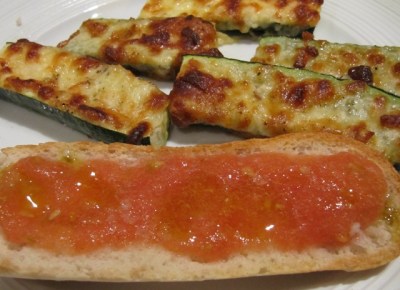 Arriba en la foto pueden ver una cena ligera y vegetariana: el pan con tomate y calabacines con queso derretido.  Esta semana trataré de montar varias recetas de tapas y entradas.  Aquí les va entonces la primera entrega.