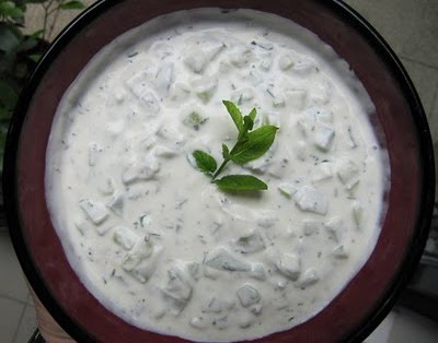 • Mezclar todos los ingredientes: yogur, pepino escurrido, un chorrito de aceite de oliva, un poco de jugo de limón, el eneldo picadito, un poquito de menta, el ajo, la sal y la pimienta.