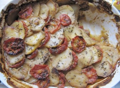 Otra receta del blog de Heidi Swanson, 101 Cookbooks, versionada a su vez de una de Sunday Suppers at Lucques, de Suzanne Goin (Knopf, 2005). Aunque es una receta trabajosa por la cortadera de ingredientes, vale la pena hacerla porque es una delicia. Si tienen una mandolina, se ahorran la mitad del tiempo. Yo hice la mitad de la cantidad original, como para unas 5-6 personas. Creo que es una receta que vale la pena, como base para preparar vegetales gratinados. Además, con las especias que le pone Heidi Swanson, hay una combinación de sabores y texturas inusual, bastante ligera comparada con otros platos al gratén que suelen ser pesados.