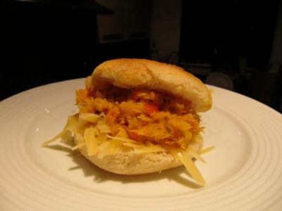 - En la receta original se usan 500 g de pescado, pero nos sobró mucho guiso, cosa que no nos preocupó en absoluto, como pueden ver en la foto de abajo: unas arepitas rellenas con queso amarillo (edam) y cazón. Casi (¡casi!) sabían como las del Mercado de Conejeros en Margarita…