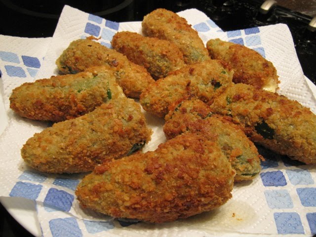 La receta está basada en una de Allrecipes, pero con variaciones personales y algunos tips tomados de las reseñas en esta página.  Como todos los platos rellenos, lleva un poco de trabajo y tiempo, pero vale la pena.  Según leí, los jalapeños congelan muy bien, así que se puede hacer una tanda grande, freír los que se vayan a comer y congelar el resto.  Eso hice, pero no los he descongelado aún (cuando lo haga les digo si funciona).