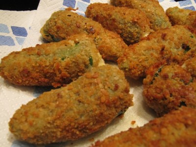 Hoy estaba en un mercadito-joyería que queda cerca de mi casa, buscando un poco de inspiración a ver si salía de esta racha de flojera gastronómica, y me tropecé con una cesta llena de jalapeños.  Por un momento pensé en hacer una receta de chiles encurtidos que me enseñó la mamá de mi amiga Nicole, pero luego recordé que tenía cheddar en la casa (y ganas de comer fritanga), así que esto fue lo que salió.