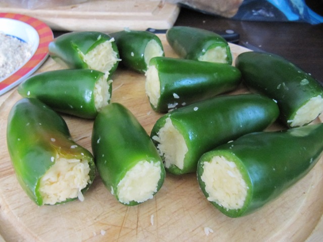 • Rellenar firmemente cada jalapeño.  Es más fácil hacerlo usando una cucharita pequeña, tipo de bebé, y empujando un poco con el dedo.