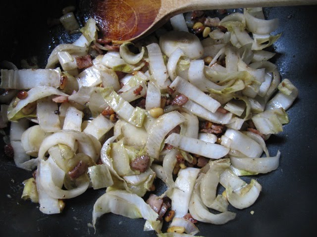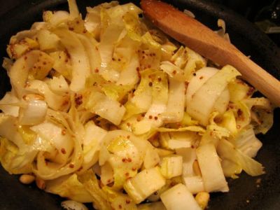 - Echar las endivias, y saltear hasta que estén calientes (sólo unos segundos, para que no pierdan la textura crujiente). Remover del fuego y rociar con la vinagreta, revolviendo bien.