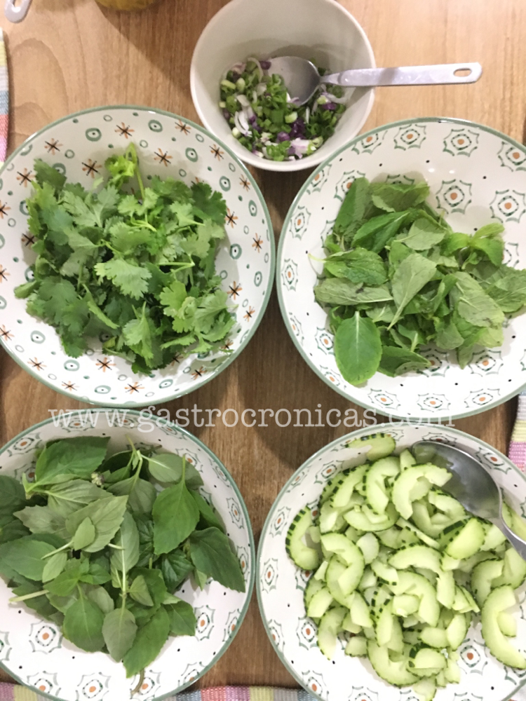 Originalmente, llevan albahaca tailandesa, que es mucho más fragante que la que se usa en la cocina italiana. Lo mismo con la menta vietnamita. Pero si estas hierbas asiáticas no se consiguen, se pueden sustituir sin problema. No dejen de ponerles cilantro también. Y un buen toque de salsa sriracha 🤤