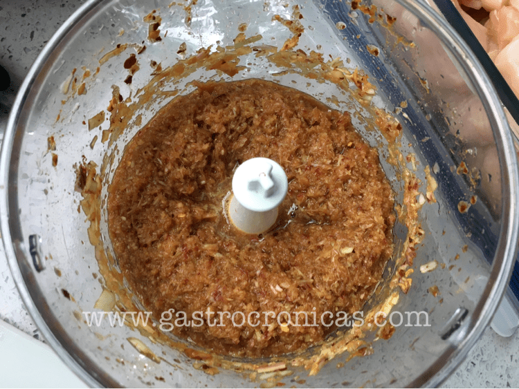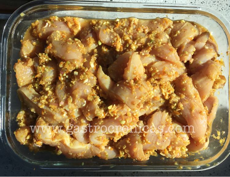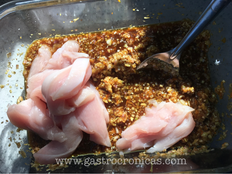 Pueden fajarse a cortar todo pequeñito, o pueden meter todos los ingredientes (excepto el pollo, claro está) en un procesador. Combinar con las tiritas de pollo y dejar marinar por varias horas (preferiblemente unas 24 horas).