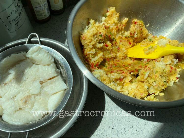 - En un bowl amplio, batir el huevo y agregar los vegetales cortados, la pasta de curry y las especias. Agregar el puré de papas y el pescado desmechado. Sazonar con sal y combinar sin sobremezclar. Probar para ajustar la sazón. Si les gusta el toque cítrico, pueden ponerle ralladura de limón.