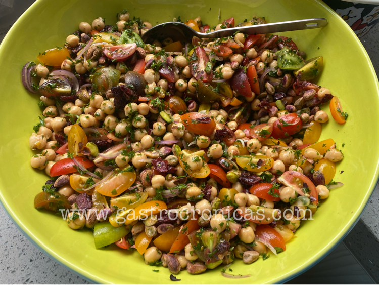 Esta ensalada es riquísima y bastante fácil de preparar. Se podría convertir fácilmente en plato único con halloumi al gril, o con pedacitos de pollo asado. Los sabores son inspirados en la comida Maghrebi o del norte de África.