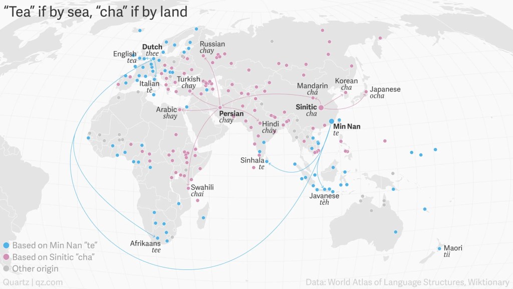 Un poquito de etimología: chai es te, te es chai, así que cuando lean en un menú chai tea, ya saben que alguien no leyó nunca la historia. Este gráfico lo tomé de este artículo de Quartz: «Te por mar, cha por tierra», cortito pero súper ilustrativo. O aquí en Wikipedia.