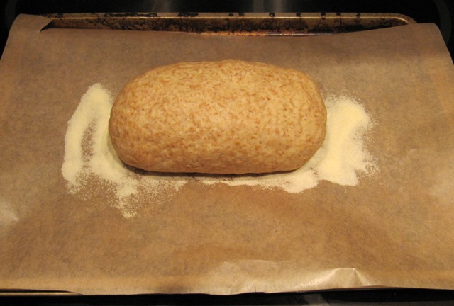 Mientras crece la masa (bien tapada para que no le salga costra), preparen la bandeja. Para el tamaño de nuestra masa (casi un kilo en total), se necesita una bandeja de buen tamaño (la mía es de 23x35x2.5 cm, para que tengan una idea). Si tienen semolina, engrasar la bandeja ligeramente y espolvorear una capita muy fina (¡no abusen!). La semolina le da una textura crujiente divina a la base de la focaccia. Si no tienen, no pasa nada. Simplemente engrasen la bandeja y ya.