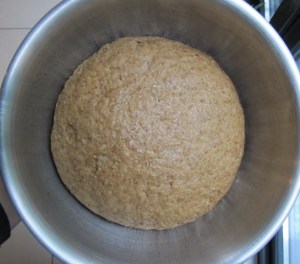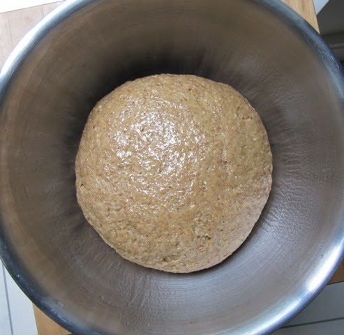 Poner el agua en el bol de la batidora y agregar solo la harina. Mezclar hasta que todo esté homogéneo. Cubrir con plástico (yo no soy muy partidaria de cubrir con trapo porque siento que, aunque esté húmedo, igual se reseca todo). Dejar reposar entre 30 minutos a una hora. Este paso se llama autólisis (autolyse, en francés). Aunque es un término de biología, en panadería se refiere a un tiempo de espera antes de empezar la fermentación gracias al cual la masa se vuelve más elástica, mejora la estructura y luego es más fácil de moldear. Este paso es particularmente útil cuando uno hace masas que luego se van a estirar, tipo pizza o pita. Después de los 30-60 minutos, se puede proceder al siguiente paso (ver abajo).