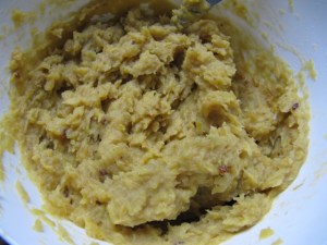 - Se pone en el centro de la hoja unas 3-4 cucharadas del guiso de cazón (que tiene que estar frío, porque de lo contrario va a romper la masa), dejando unos buenos bordes como se muestra en la foto de abajo. La diferencia de posición del guiso que ven en la foto es simplemente la cocinera experimentando para ver cómo se enrollaba mejor la pasta. No hubo diferencia sustancial…