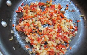 - Agregar luego los tomates, pimentón y ajíes. Saltear por unos 5-7 minutos más, hasta secar un poco más.
