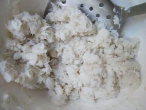 - Lo primero es chequear que el pescado no tenga espinas, para evitar sorpresas después. Luego se pone a hervir con un poco de agua. Si quieren guardar el caldo para hacer sopa o risotto, por ejemplo, pueden poner un trocito de jengibre, cebollín, un diente de ajo, etc. Por regla general, yo no suelo salar los caldos, de manera que si los utilizo después para otra cosa, pueda controlar bien el nivel de sal. Dependiendo del grosor de los filetes, el pescado se puede hervir entre 15-20 minutos. Una vez listo, se cuela bien y se desmenuza (chequeando de nuevo que no haya ninguna espina en el proceso). El caldo se guarda o se descarta, como quieran.