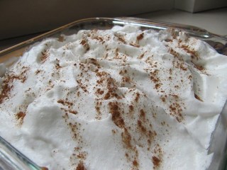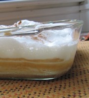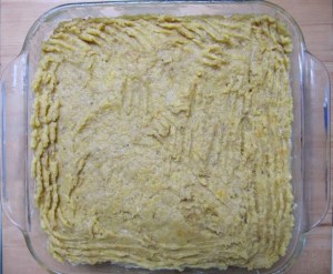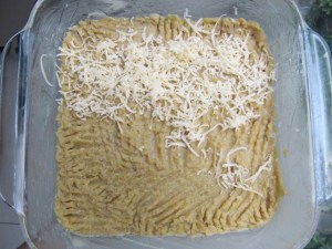 - Para armar el pastel, engrasar el molde con un poco de mantequilla y precalentar el horno a 175º C / 350º F. Tienen que decidir si quieren hacer varias capas de cada ingrediente o si prefieren hacerlo tipo sandwich (plátano-queso, guiso, plátano-queso), de modo que dividan bien las cantidades. En mi caso, como no hice grandes cantidades, preferí esta última opción, que es la que les doy aquí: formar una capa con la mitad del puré de plátano, aplanándola con la parte de atrás de una cuchara o con una espátula para que quede uniforme. Luego rociar con la mitad del queso (ser generosos). Poner todo el guiso, distribuyéndolo uniformemente y aplanando bien para que no queden «burbujas». Cubrir con lo que queda de plátano, mismo procedimiento. Rociar con el queso, tratando de cubrir toda la superficie del pastel. Resumiendo: plátano, queso, guiso, plátano, queso.