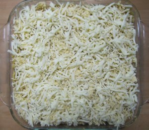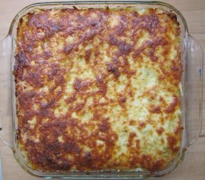- Hornear por 20 minutos a 175º C / 350º F, luego encender el broil a temperatura alta y dejar hasta que dore la capa de queso (en mi horno son unos 5 minutos, pero supongo que si el horno es muy potente, esto puede demorar sólo unos segundos).