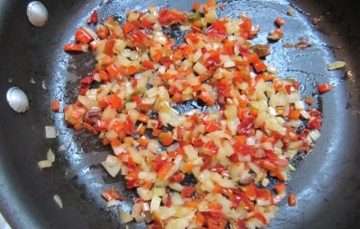 - Para hacer el sofrito que le va a dar todo el sabor al guiso (secreto de la cocina venezolana): poner a calentar un poquito de aceite onotado (o aceite de oliva, si quieren algo más light) en un caldero o sartén a fuego medio. Saltear la cebolla primero por un par de minutos. Cuando empiece a cambiar de color, agregar el pimentón y seguir salteando por unos 3 minutos más. Agregar el ají dulce y el cebollín, cocinar por 1 ó 2 minutos y, por último, echar el cilantro.