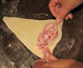 - Place a handful of ham in the base of the triangle (adjust the amount to the size of each one) and roll it up to the vertex (assuming it’s an isosceles). Two tricks to avoid spillage: