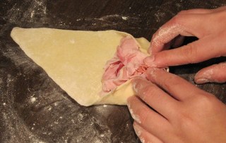- Before beginning to roll it up, fold the external borders of the triangle as if forming a pocket around the ham.
